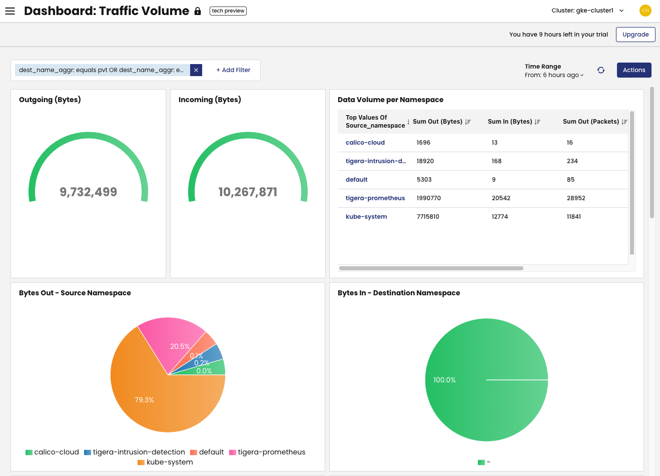 The Traffic Volume dashboard provides a high-level view of traffic in your cluster.